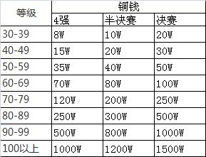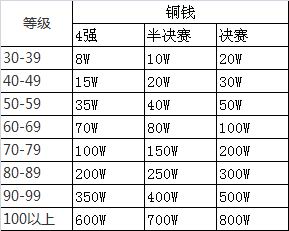 奖励设置本服选拔赛奖励 冠军20000声望、1000W铜钱、冠军制服。 亚军20000声望、800W铜钱 第3、4名15000声望、600W铜钱 第5-8名10000声望、400W铜钱 第9-16名8000声望、200W铜钱 第17-32名5000声望、100W铜钱